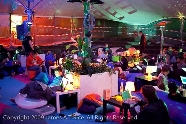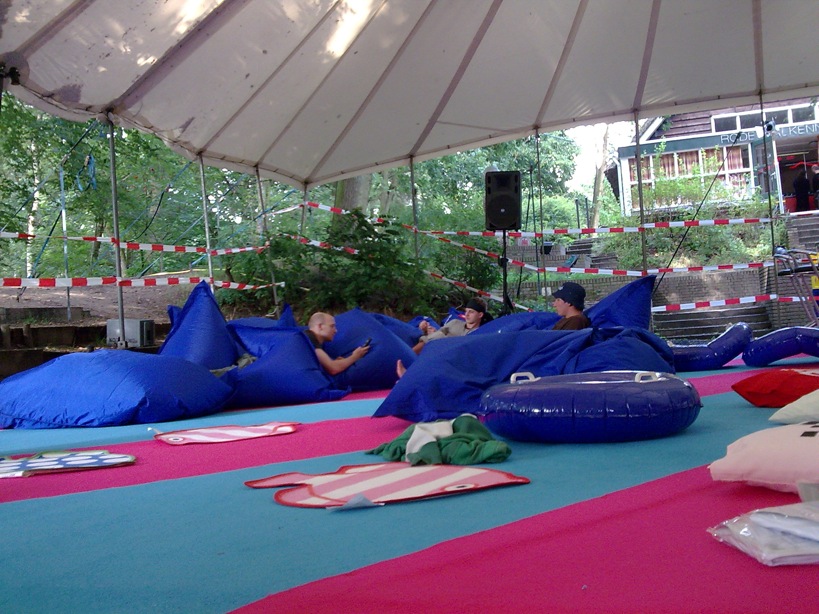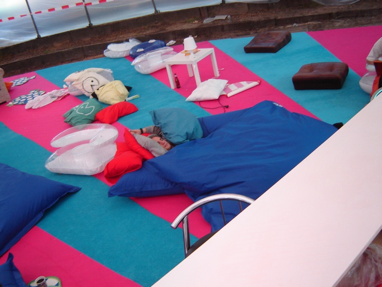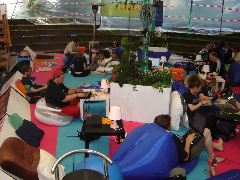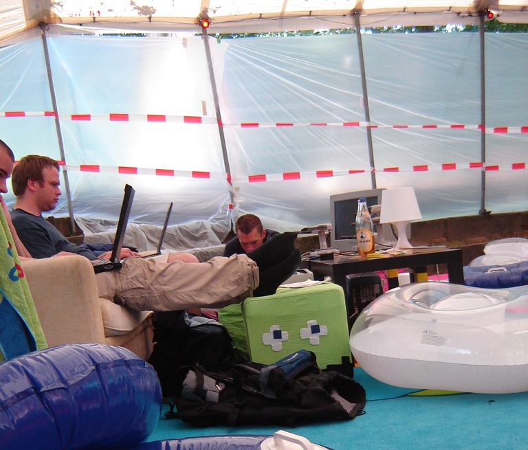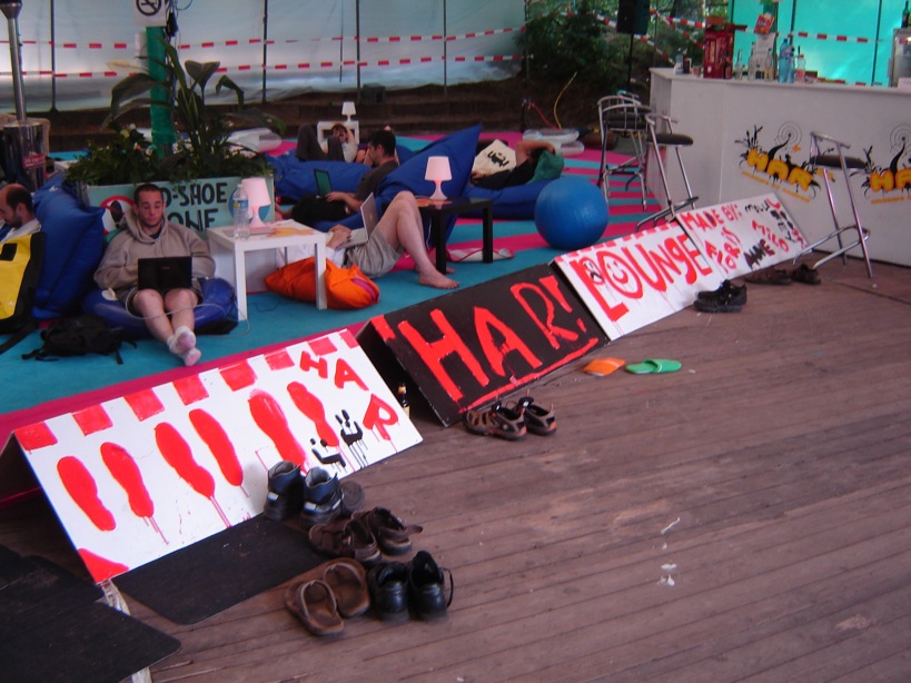During HAR2009 I was leader of the Designteam, who was in charge of developing the lounge area. This area was a large tent including a bar, decorated with soft carpet, beanbags, and lots of pillows.