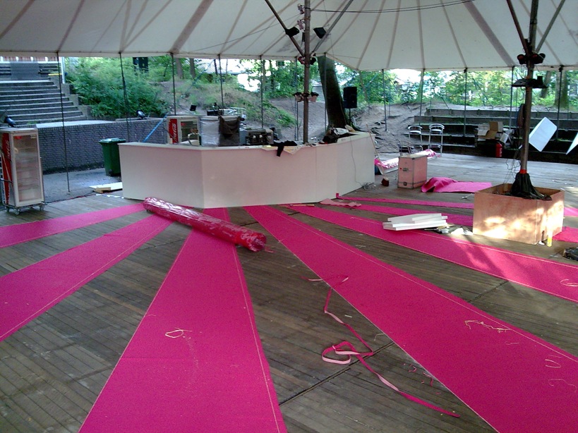 The Lounge was situated in the amphitheatre of the large camping area of the festival. We've made a wooden floor to make sure people wouldn't get wet feet when it would rain. This floor was coated with carpet, to create a more cosy and 'living room' feel.